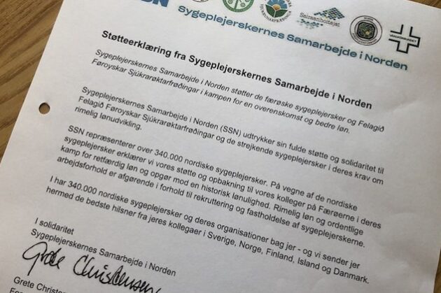 Sygeplejerskernes Samarbejde i Norden hevur í brævi í dag boðað frá, at tey stuðla verkfallinum hjá Felagnum Føroyskir Sjúkrarøktarfrøðingar og…
